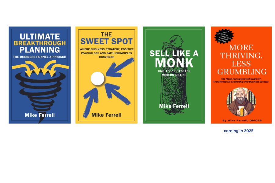 Mike’s books are: Ultimate Breakthrough Planning:The Business Funnel Approach, The Sweet Spot: Where Business Strategy, Positive Psychology and Faith Principles Converge and Sell Like a Monk: Timeless “Rules” For Modern Selling. All published by Calumet’s Wisdom Editions and available on Amazon. His newest book, More Thriving, Less Grumbling: The Monk Principles Field Guide for Transformative Leadership and Business Success will be released in 2025.