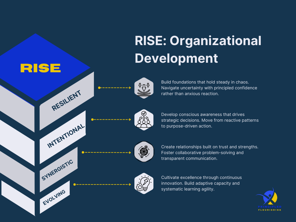 RISE Organizational Development builds four critical capabilities: Resilient foundations that hold steady in chaos Intentional awareness that drives strategic decisions Synergistic relationships built on trust and strengths Evolving excellence through continuous innovation