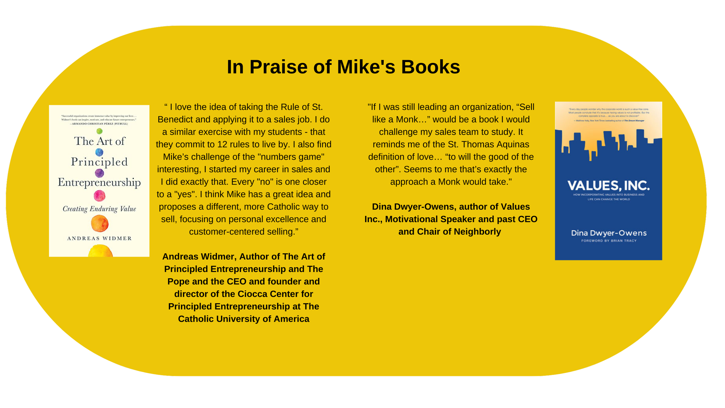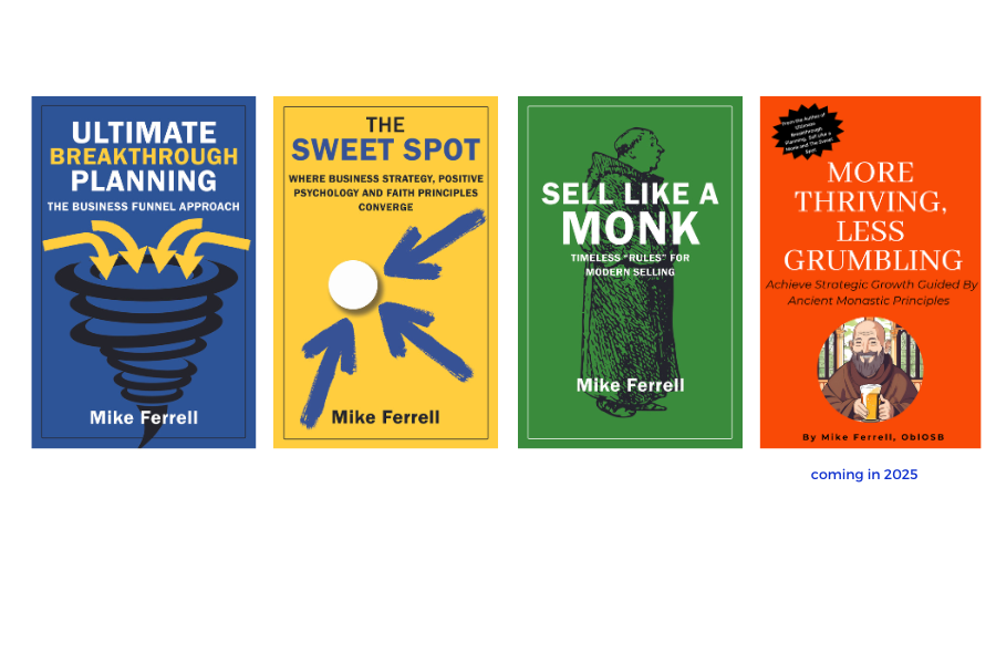Mike’s current books published by Calumet’s Wisdom Editions: Ultimate Breakthrough Planning: The Business Funnel Approach and The Sweet Spot: Where Business Strategy, Positive Psychology and Faith Principles Converge and Sell Like a Monk: Timeless “Rules” For Modern Selling. In 2025 Mike’s newest book, More Thriving, Less Grumbling: Achieve Strategic Growth Guided By Ancient Monastic Principles will be released.